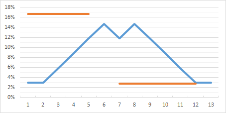 On observe très nettement pour WWC que les probabilités sont équilibrées et centrées autour d'une réussite moyenne "habituelle", et qu'elles diminuent progressivement lorsqu'ils s'agit de réussites "inhabituelles" tendant vers le coup d'éclat ou l'échec critique.